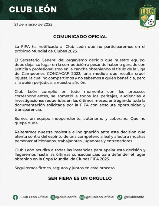 Ante esta decisión, Grupo Pachuca ha manifestado su inconformidad y analiza la posibilidad de apelar ante el Tribunal de Arbitraje Deportivo (TAS), buscando hacer valer el derecho deportivo de Club León, el cual obtuvo su clasificación tras ganar la Concacaf Champions Cup.